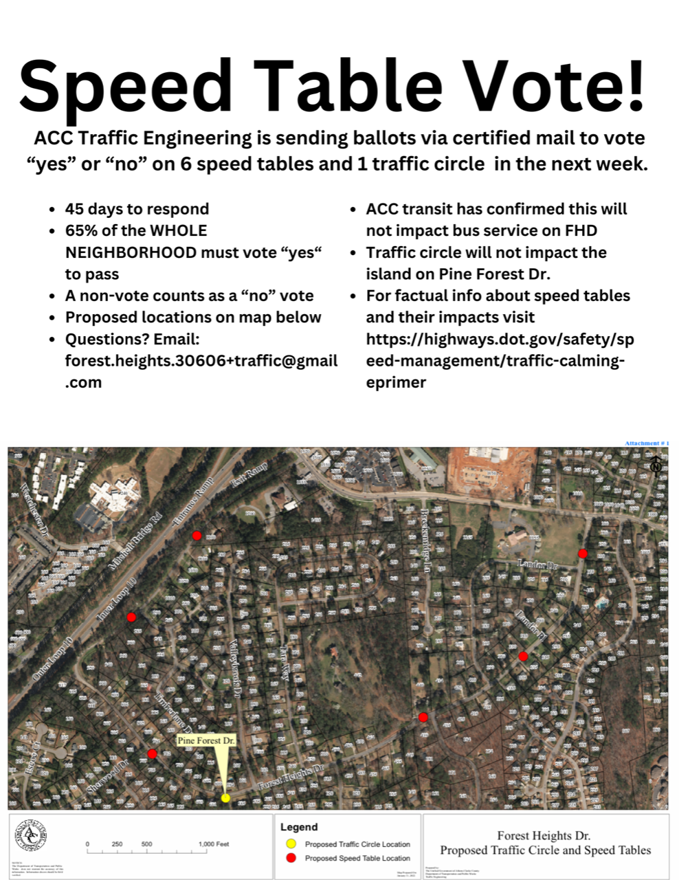 It also suggests a DOT website with information about the effectiveness of speed tables. And it include an email address for anyone who has questions: forest.heights.30606+traffic@gmail.com. Please spread the word, so that everyone is aware of the opportunity to vote!